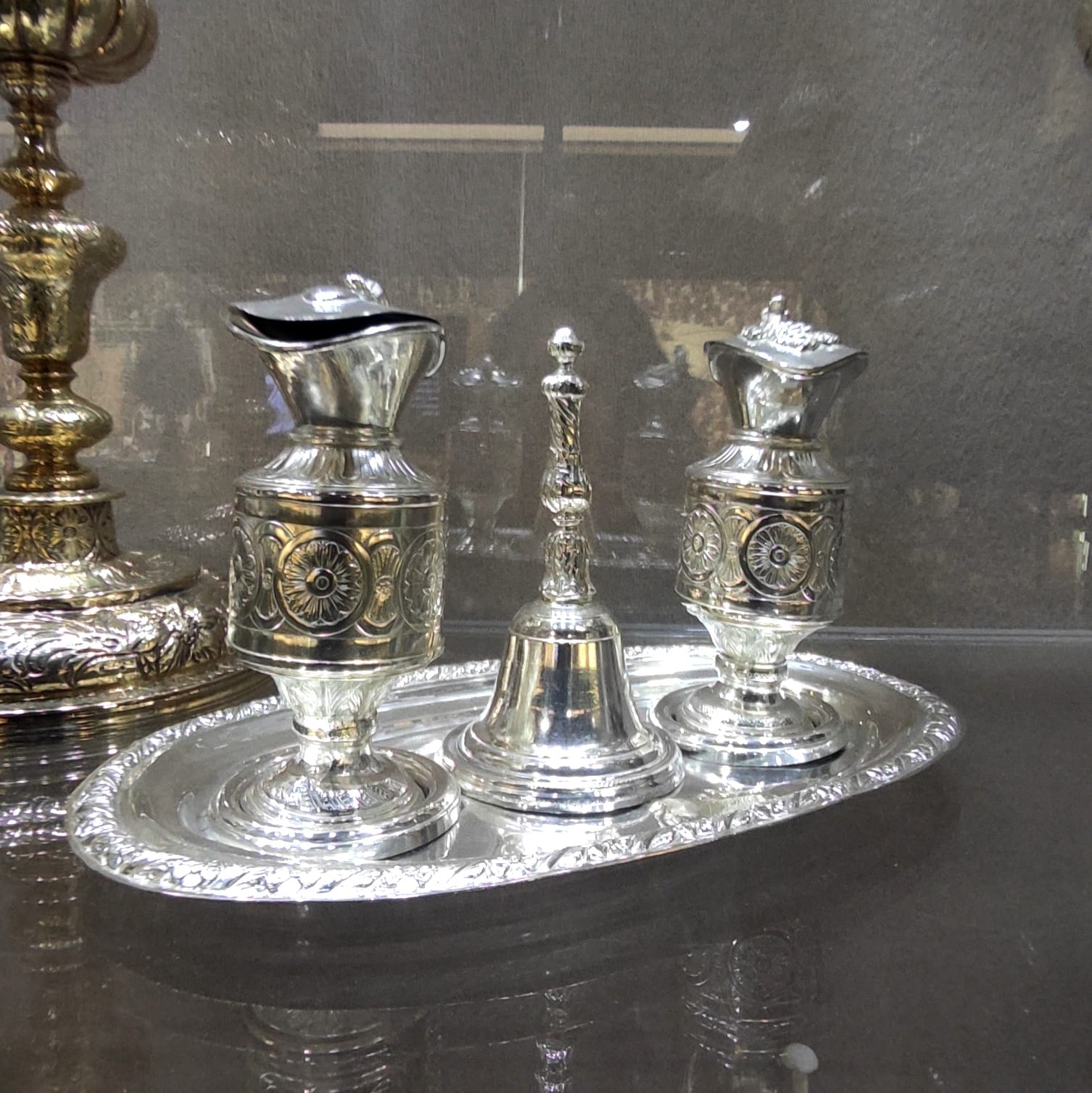Jarras pequeñas utilizadas en Misa para llevar el agua y el vino que se emplean en la consagración. Estas en concreto son del siglo XIX, labrada y cincelada en plata. Cada una de ellas muestra en su tapa un pez, para la del agua, y para la del vino un racimo de uvas.
